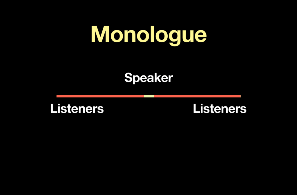 Monologue is this idea of teaching coming from a select few. The small minority will be the speakers, whilst the majority present will function almost entirely as listeners.
